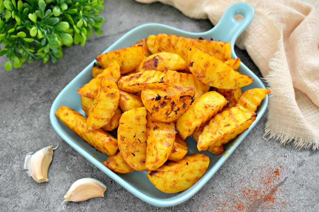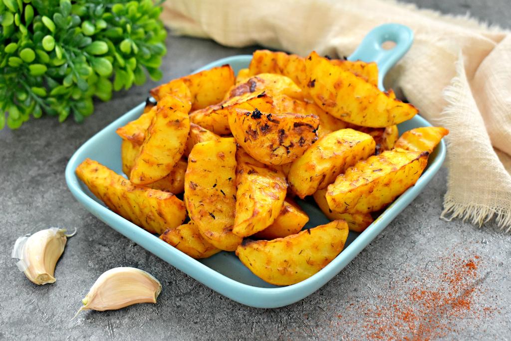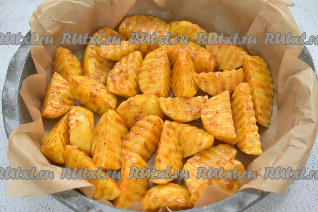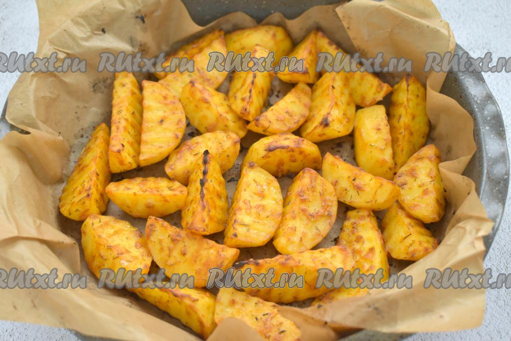 Для того чтобы проверить готовность, нужно проколоть картофельные дольки зубочисткой. Если картошка прокалывается легко, значит она готова. Продолжительность запекания во многом зависит от величин долек и, безусловно, сорта картофеля.