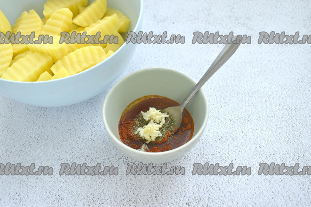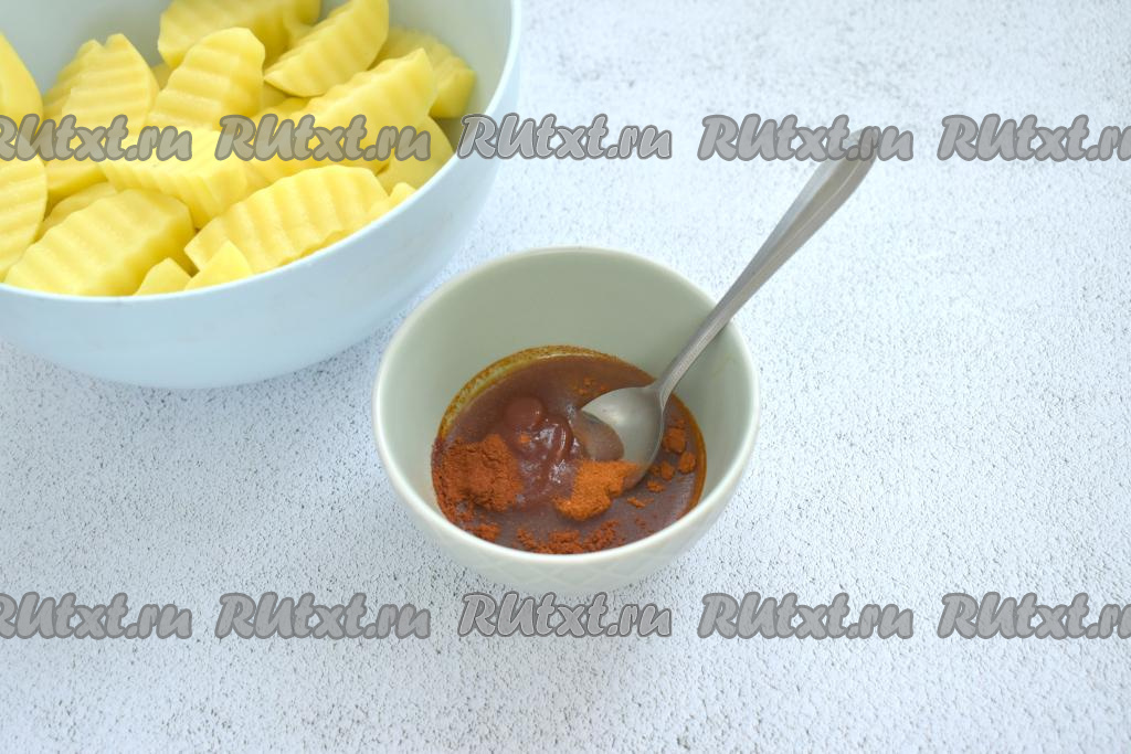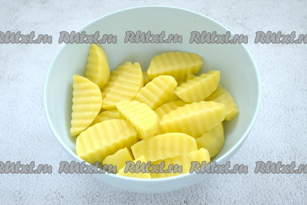 Очищаем картошку, нарезаем её на небольшие дольки и складываем в миску. Я для нарезки использовала фигурный нож, чтобы запечённая картошка выглядела аппетитно.