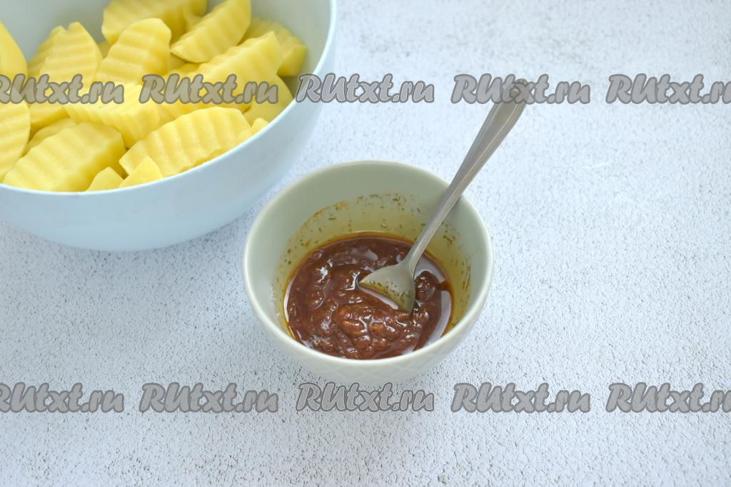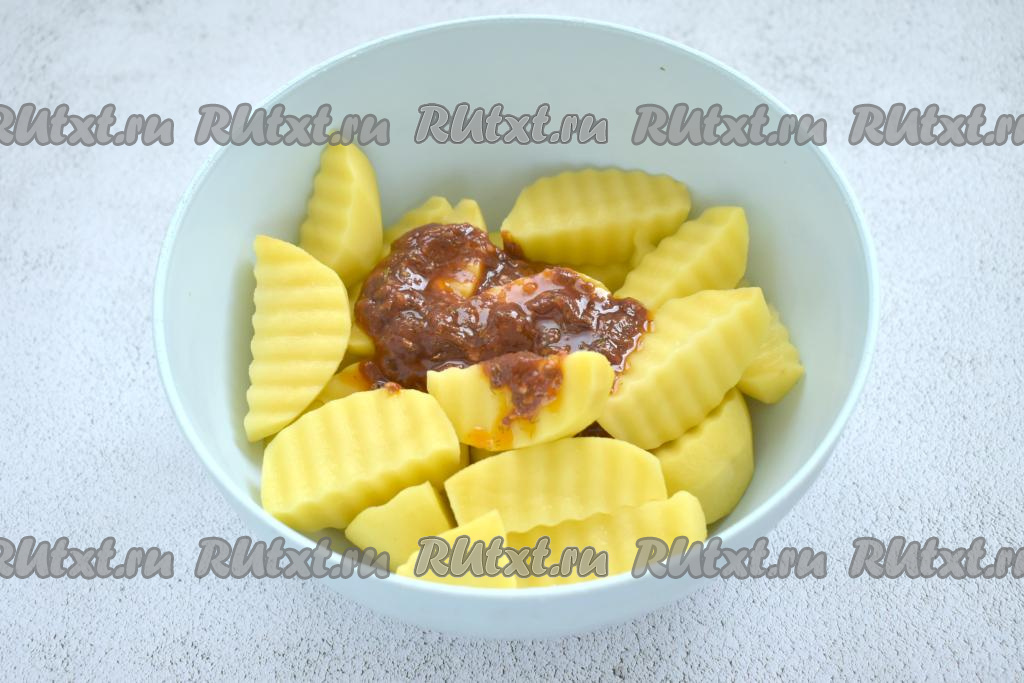 Получившийся томатный соус перекладываем в миску с картошкой, хорошо перемешиваем, покрывая картофельные дольки соусом со всех сторон.