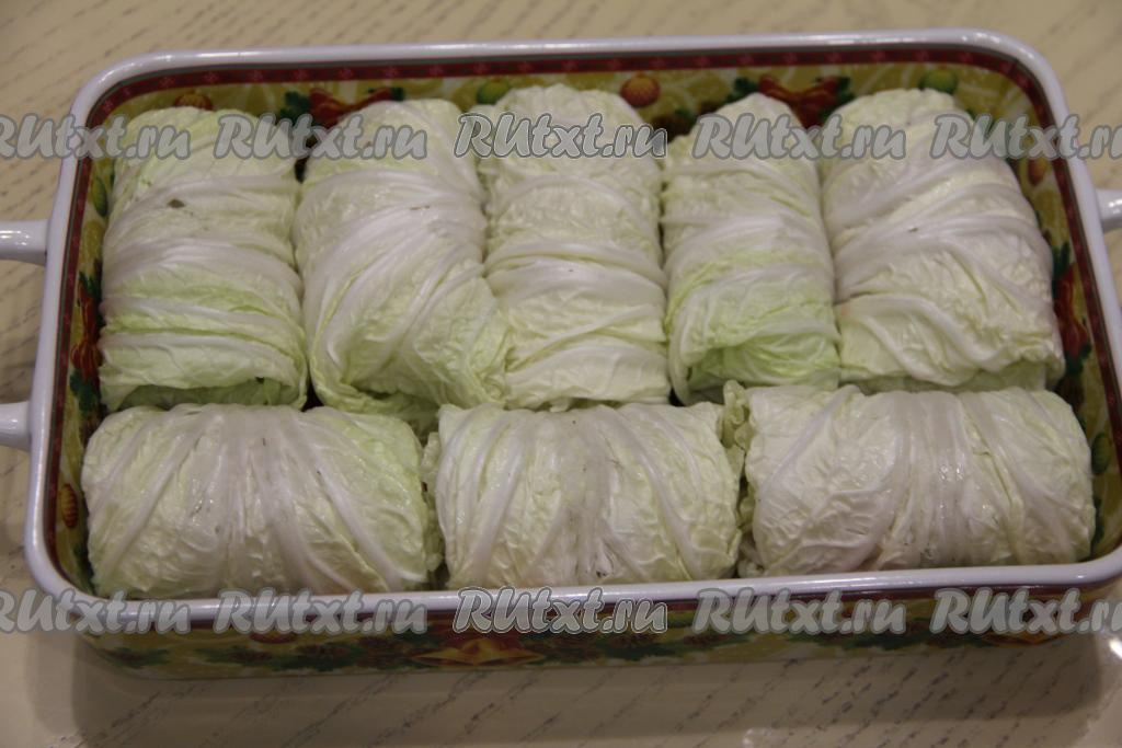 Запекать голубцы из пекинской капусты с фаршем в разогретой до 200 градусов духовке в течение 40-45 минут.