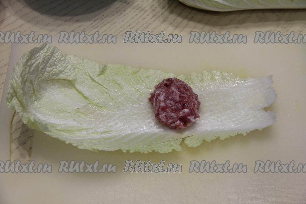 Завернуть фарш в несколько оборотов листа, затем мягкую часть листа, выступающую с двух сторон по бокам от фарша, немного подогнуть к центру.