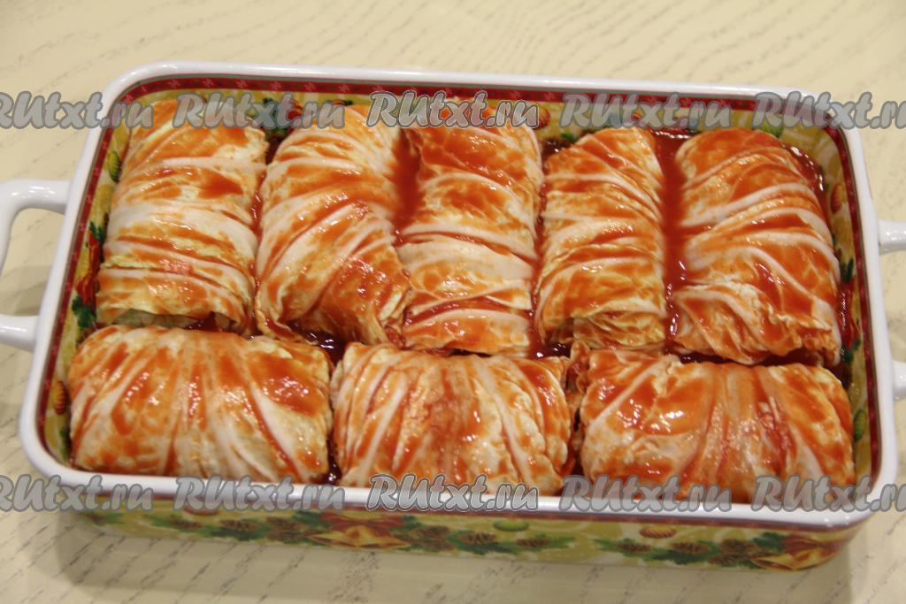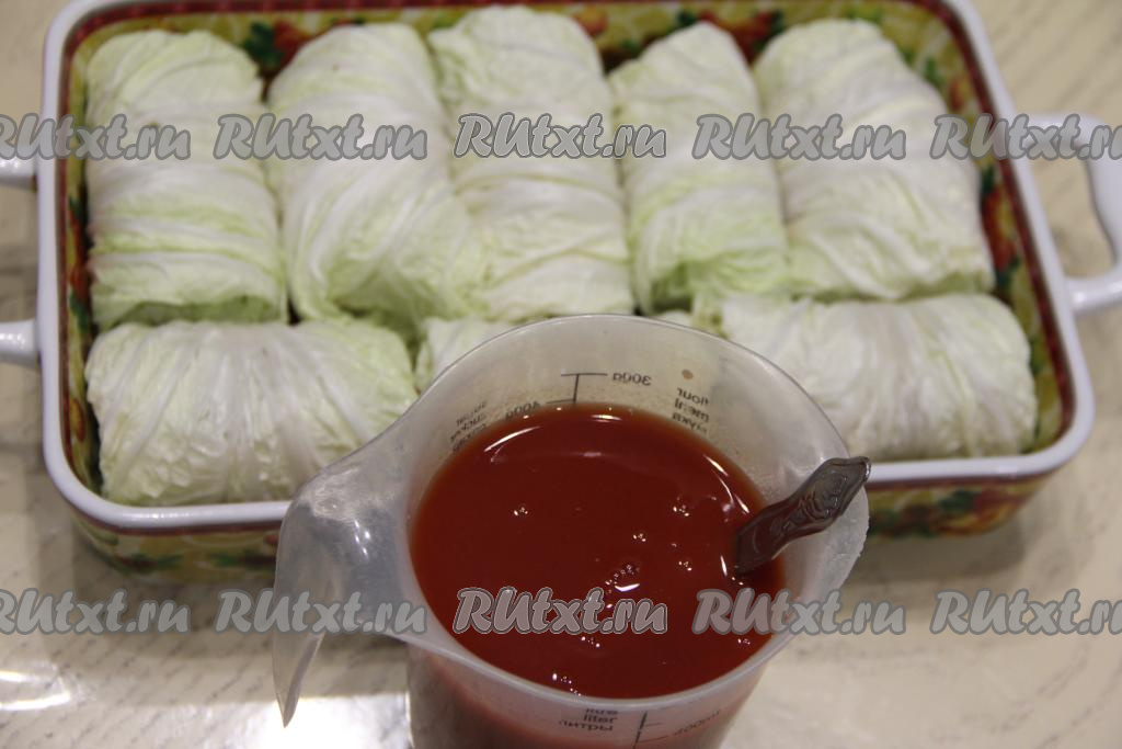 Влить получившийся томатный соус в форму поверх голубцов из пекинской капусты. Прикрыть форму фольгой и поставить в разогретую до 200 градусов духовку.