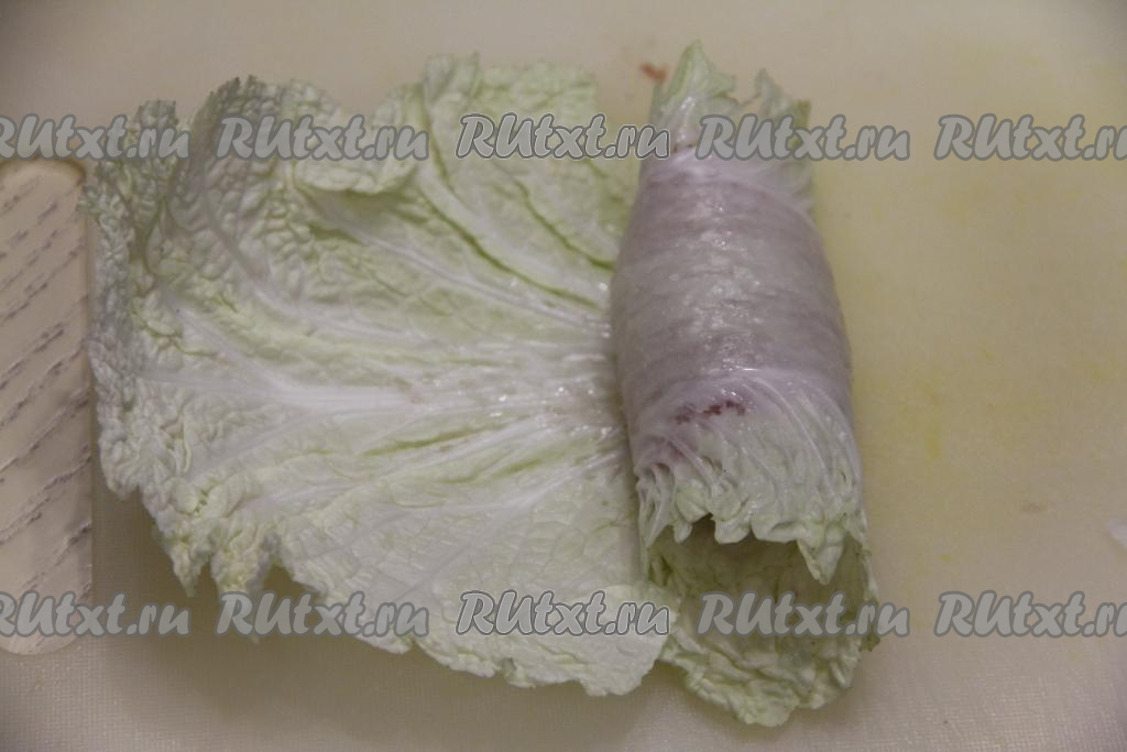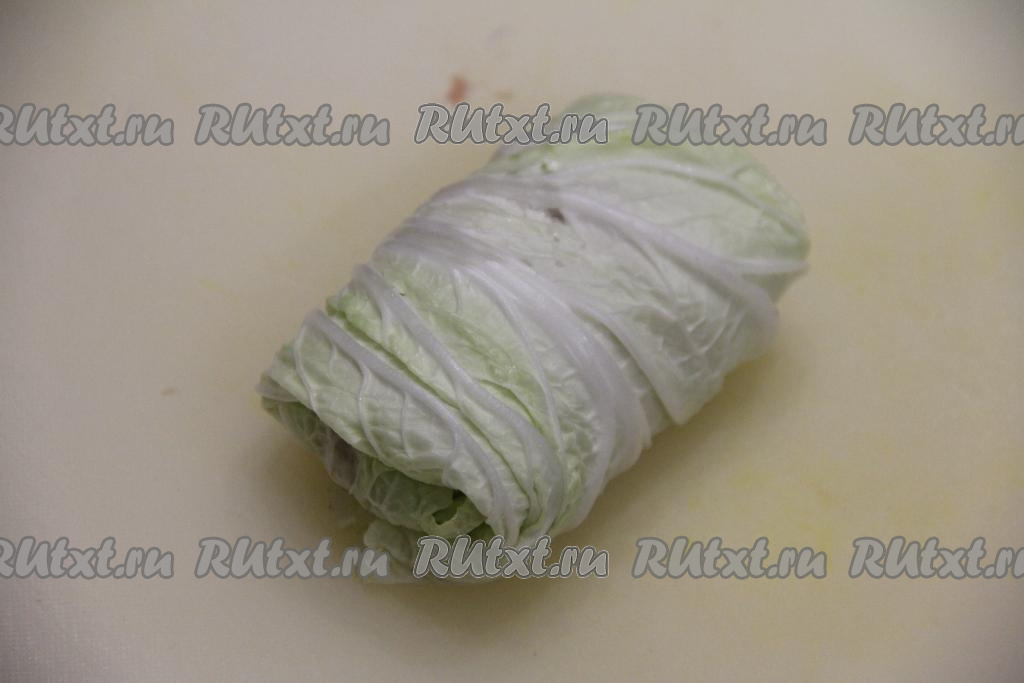 И, продолжая сворачивать лист пекинской капусты в рулет, окончательно сформировать голубец, как на фото.