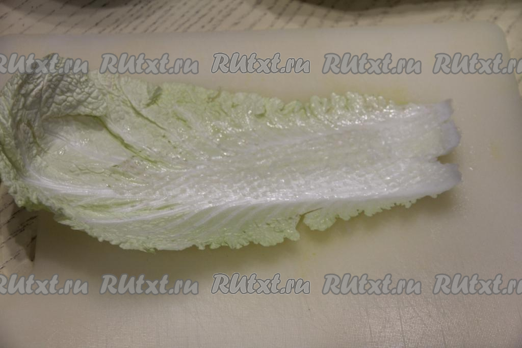 Листья пекинской капусты промыть холодной водой. Немного отбить кулинарным молоточком жёсткую часть каждого листа у основания.