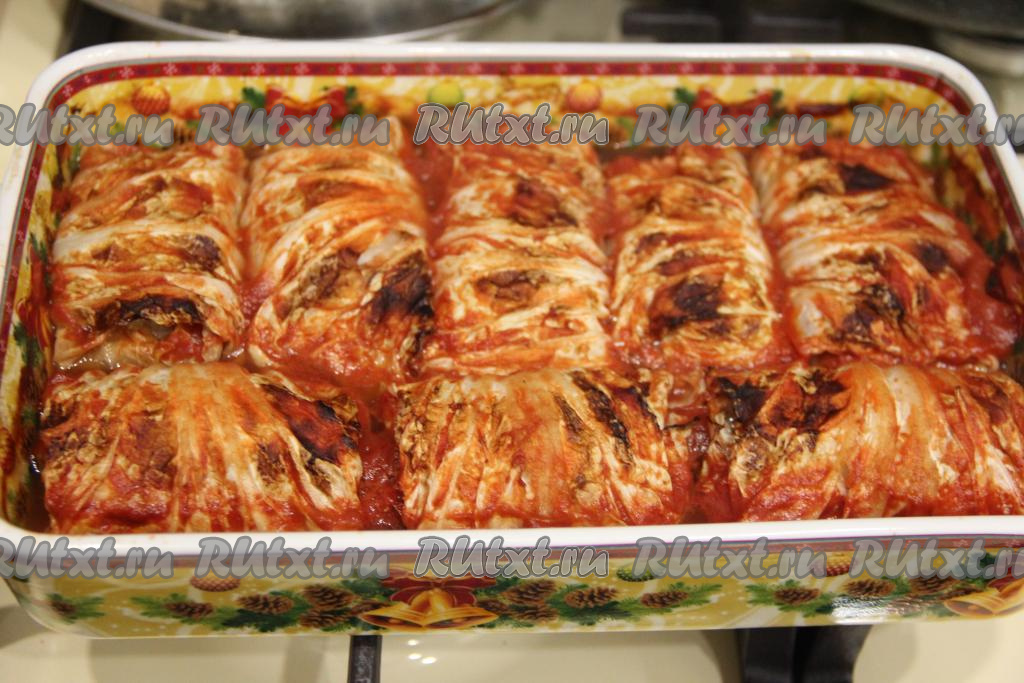 Из пекинской капусты можно приготовить в духовке вкуснейшие голубцы с начинкой из мясного фарша. В отличие от белокочанной капусты, листья пекинской капусты не нужно заранее отваривать, достаточно будет просто жёсткую часть каждого листа немного отбить молоточком. Фарш для этого блюда можно взять любой (например, куриный, свиной или смешанный). Голубцы получаются вкусными, нежными, достаточно сытными, подавать их к столу лучше горячими, поливая томатным соусом, в котором они запекались.