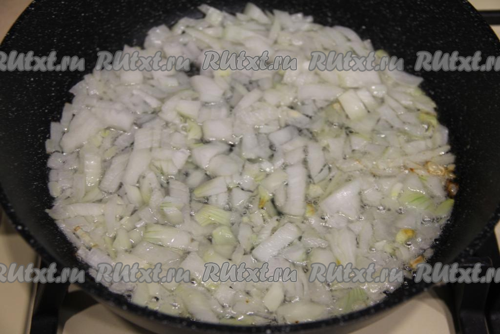 В сковороду влить растительное масло, хорошо разогреть, выложить мелко нарезанный лук. На среднем огне обжарить лук в течение 5 минут (до прозрачности), периодически помешивая.