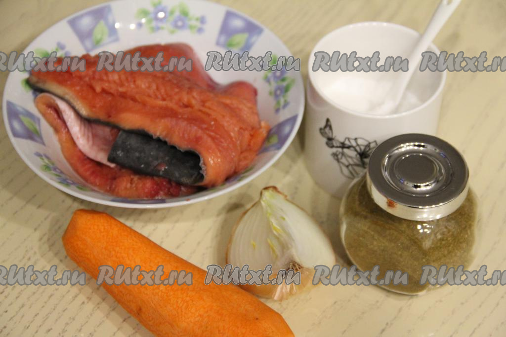 Подготовить продукты. Лук и морковь почистить. Для этого рецепта можно использовать филе или стейки горбуши, их нужно вымыть, обсушить. Я предпочитаю брать целую тушку горбуши и после размораживания аккуратно срезать филе с кожей (голову и хребет горбуши, оставшиеся после отделения филе, можно использовать для приготовления первых блюд).