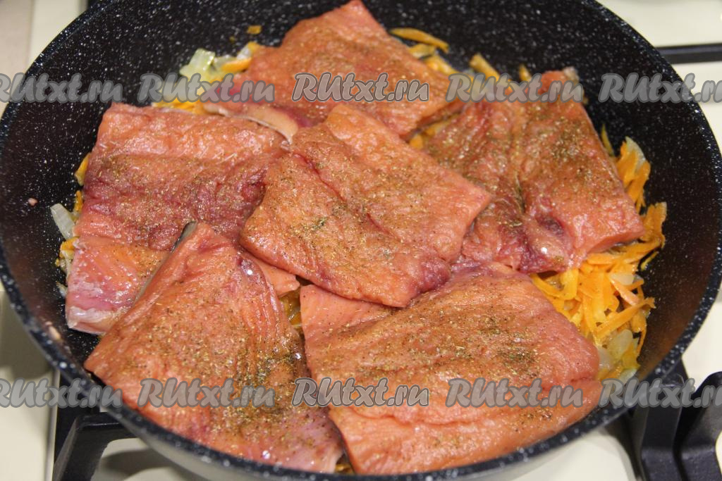 Филе горбуши нарезать на порционные кусочки. Посолить рыбу по вкусу и присыпать специями. Выложить кусочки горбуши в сковороду на овощную подушку из морковки и лука.
