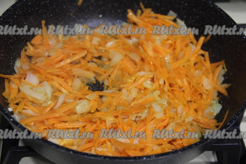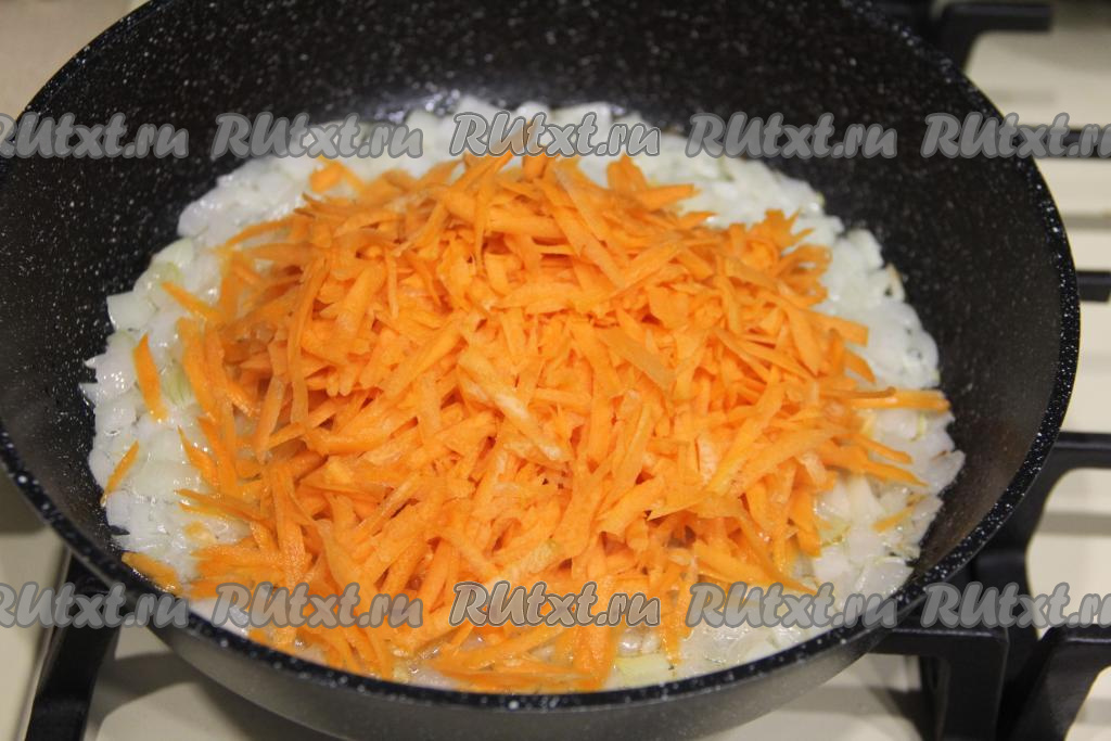 После того как лук обжарится до прозрачности, добавить в сковороду морковку, натёртую на крупной тёрке, сразу перемешать.