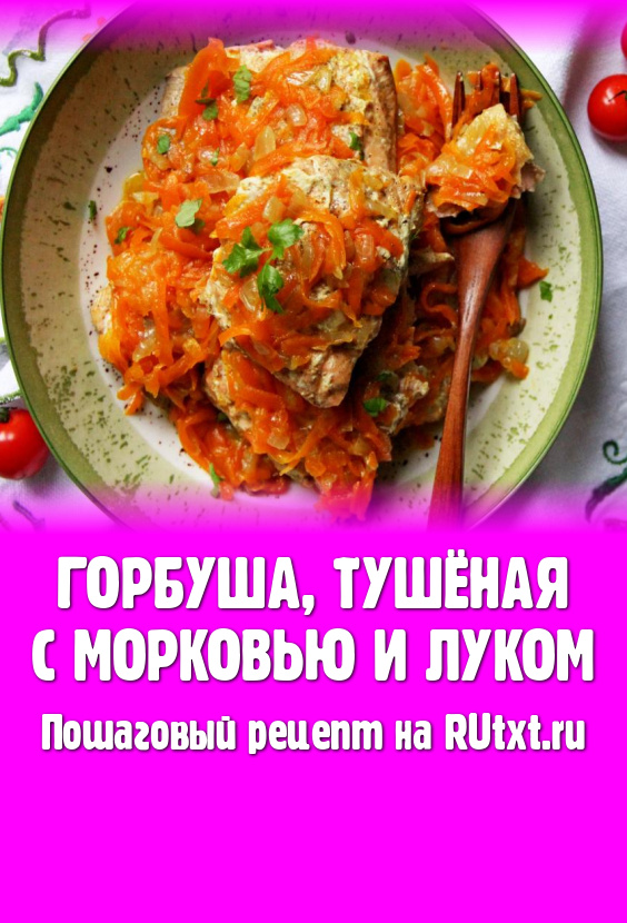 Нежную, сочную тушёную горбушу вместе с морковкой и луком переложить со сковороды на блюдо и подать к столу, дополнив гарниром на ваш выбор.
