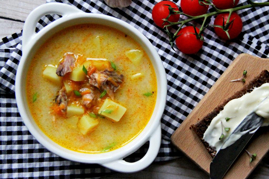 Предлагаю из частей свежей (или замороженной) горбуши сварить суп с добавлением плавленного сыра. Это первое блюдо готовится достаточно просто, а получается очень вкусным, наваристым, сытным. Плавленный сыр придаёт ему нежную, бархатистую текстуру. Приготовьте этот сырно-рыбный суп и он, наверняка, понравится всей семье!