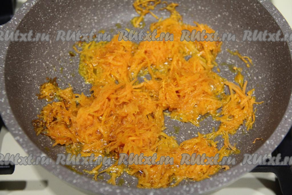 Пока варится картошка, обжарим морковь. Для этого в сковороду нужно влить растительное масло, выложить морковь, натёртую на мелкой тёрке. Обжарить морковь в течение 4-5 минут (до мягкости) на среднем огне, иногда помешивая. Снять с огня.