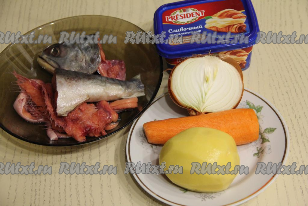 Подготовить продукты. У меня был крупный картофель, поэтому я взяла 1 клубень, если у вас средние клубни - тогда возьмите 2 картошины. Лук тоже был крупный, я взяла половину луковицы. Картошку и морковь почистить (я почистила заранее и положила картофель в миску с водой, чтобы он не потемнел). Плавленный сыр желательно взять пастообразный, он лучше растворяется в супе, но подойдёт и плавленный сырок. В качестве рыбы для супа я взяла голову горбуши, предварительно удалив жабры, а также хребтовую кость с хвостом и большие плавники.