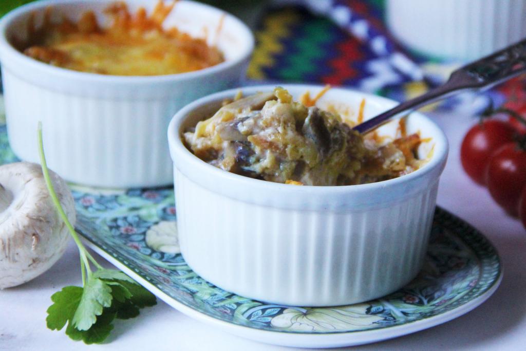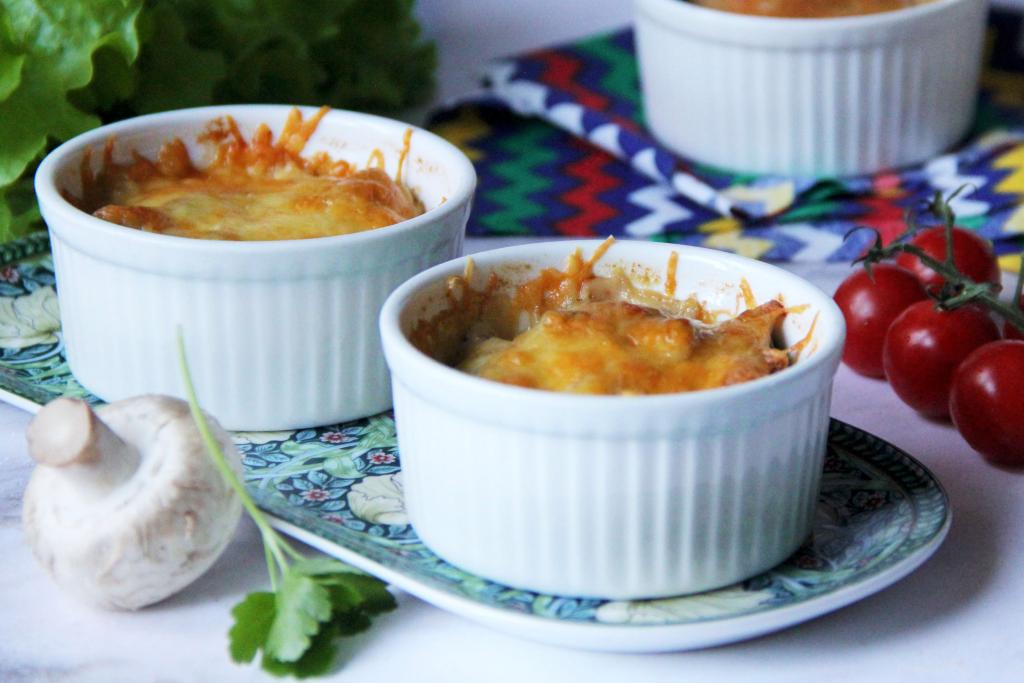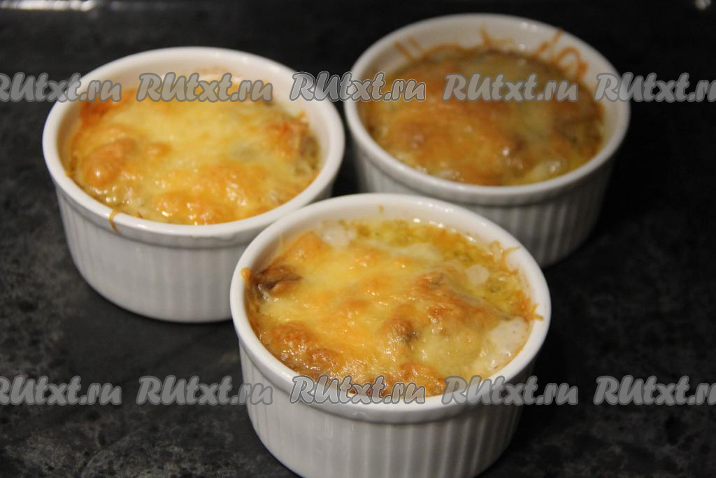 Разложить жульен по кокотницам. У меня получилось 5 порций жульена с картошкой и грибами.