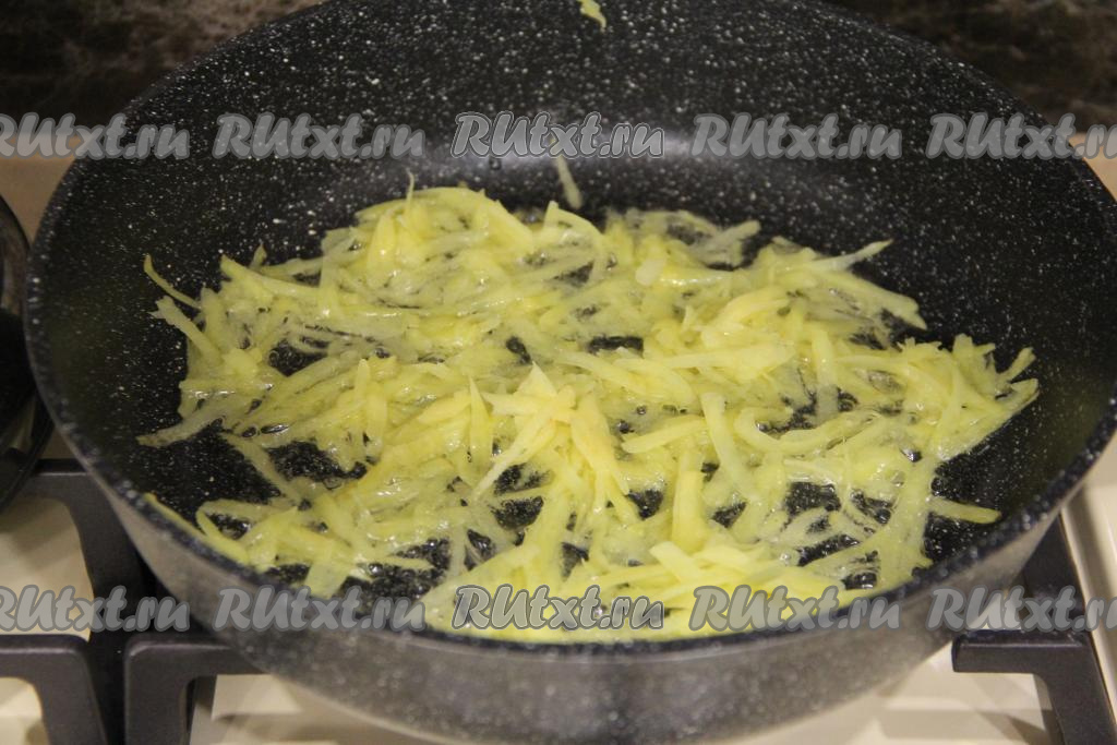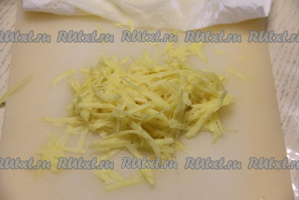 Картошку натереть на крупной тёрке (можно натереть и на тёрке для моркови по-корейски). Натёртую картошку промокнуть бумажным полотенцем, убирая выделившуюся жидкость.