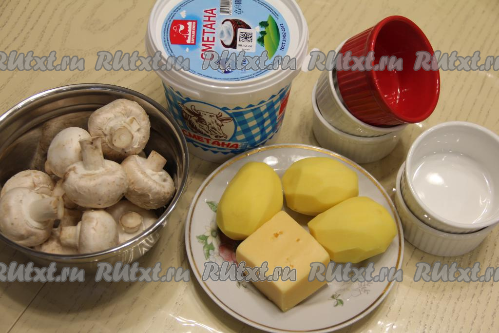 Подготовить продукты. Картошку почистить. Шампиньоны промыть под проточной водой, убирая все загрязнения с грибов.
