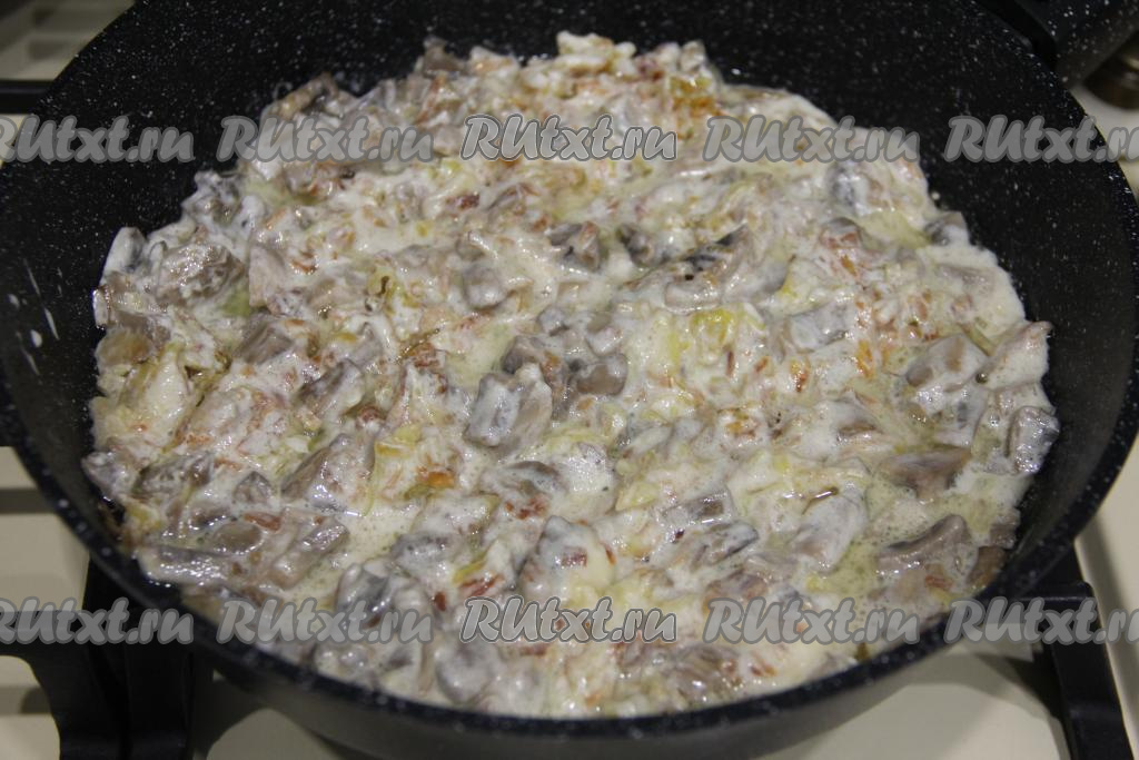 Посолить и поперчить по вкусу, перемешать грибы с картошкой, сметаной и чесноком, прогреть 2 минуты на небольшом огне и убрать с огня.