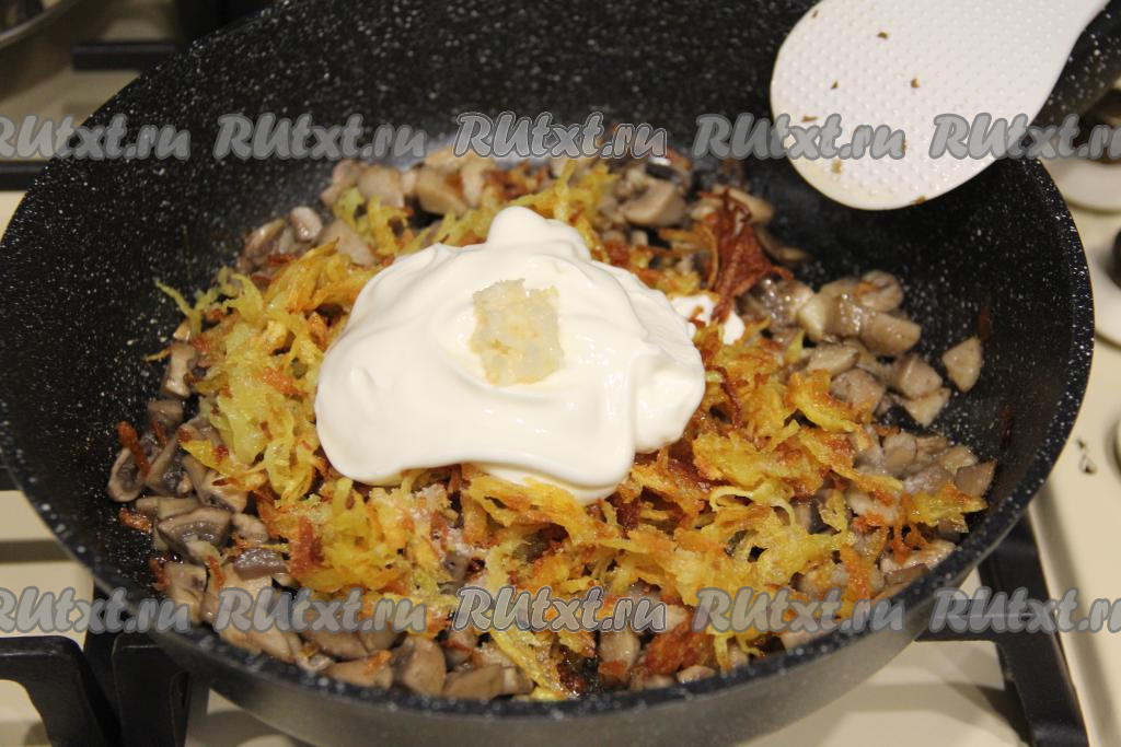Затем к шампиньонам добавить жареный картофель, сметану и пропущенный через пресс чеснок.