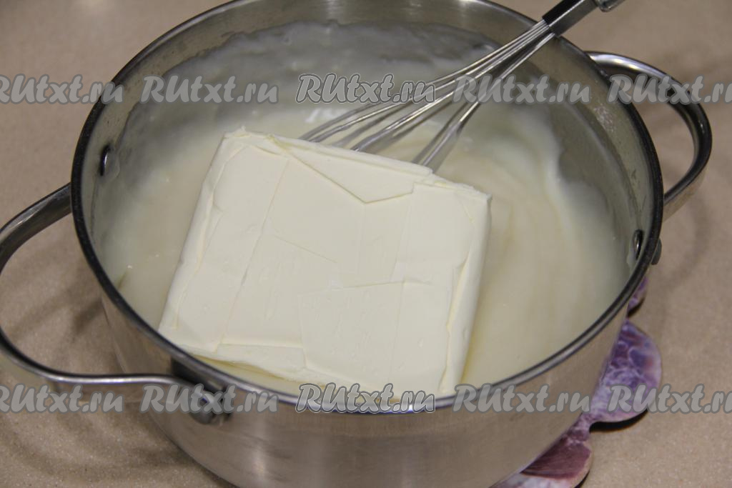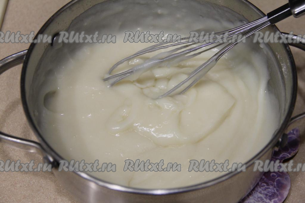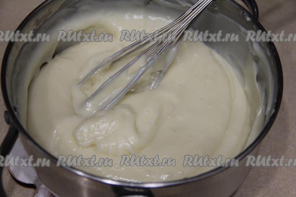 Постоянно помешивая, довести крем до кипения, а затем проварить на небольшом огне, не переставая перемешивать, в течение 3-5 минут. Заварной крем должен стать глянцевым и тягучим, снять кастрюлю с огня.