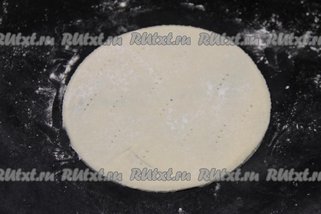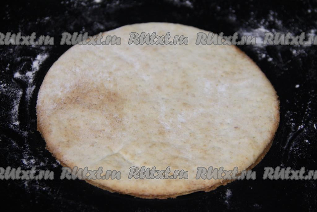 Тесто нужно будет сразу раскатывать на пергаменте или на коврике для выпечки, на котором вы в дальнейшем будете выпекать корж в духовке. Каждую часть теста достаточно тонко раскатать на силиконовом коврике (или на пергаменте) для выпечки, слегка припылённом мукой. Раскатывать нужно в круг диаметром 18 сантиметров (для того чтобы получился круг нужного диаметра, можно поверх раскатанного теста приложить, например, тарелку диаметром 18 сантиметров, лишнее тесто убрать). Наколоть корж вилкой и поставить в духовку, разогретую до 180 градусов.