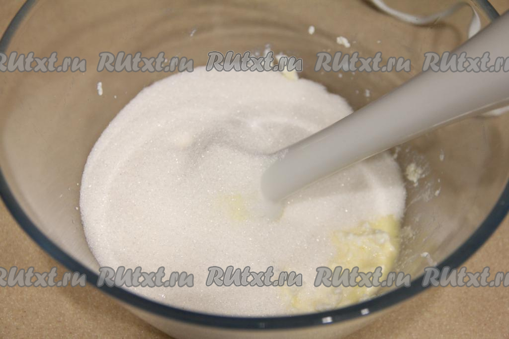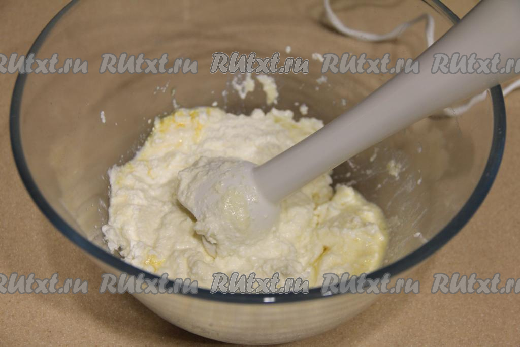 Всыпать сахар и ещё раз пробить творожную массу погружным блендером.