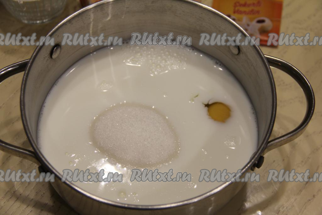 Прежде всего сварим заварной крем для творожного "Наполеона". Сливочное масло должно быть комнатной температуры, поэтому достать из холодильника его нужно заранее. Теперь можно приступать непосредственно к приготовлению крема, для этого в кастрюлю нужно влить молоко, добавить сахар, яйцо и ванильный сахар, перемешать венчиком до однородности.