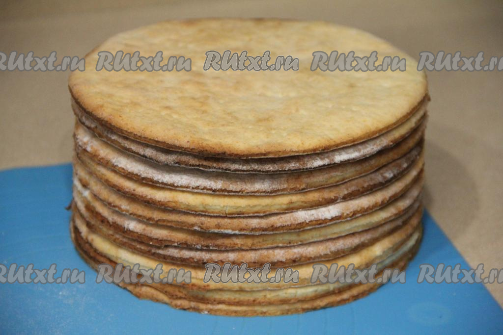Постепенно испечь 10 творожных коржей, дать им полностью остыть.