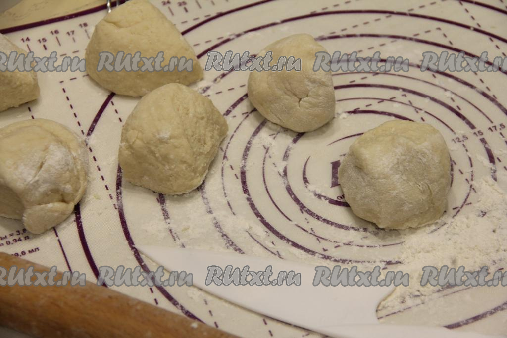 Когда тесто начнёт собираться в ком, добавляя понемногу муку, продолжать замешивать его руками. В итоге творожное тесто должно получиться мягким, нежным, не сильно липнущим.