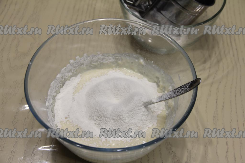 Частями начать добавлять муку, вначале вмешивая её в творожное тесто столовой ложкой.