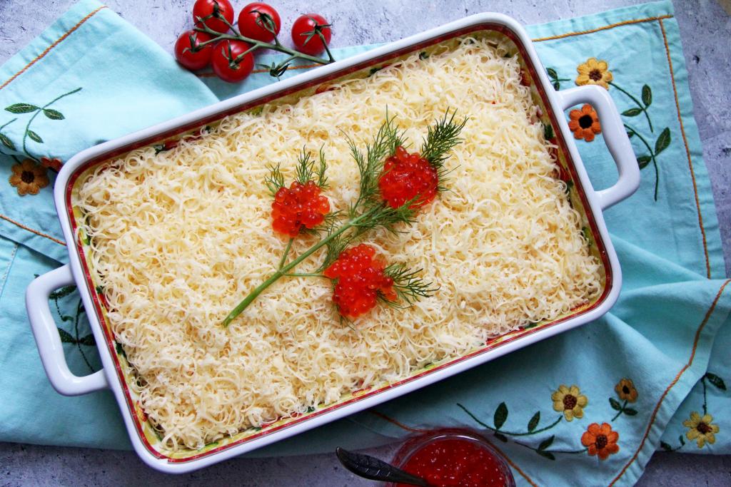 Сверху нанести решётку из майонеза и аккуратно утрамбовать. Натереть желтки на тёрке и выложить поверх крабового слоя.