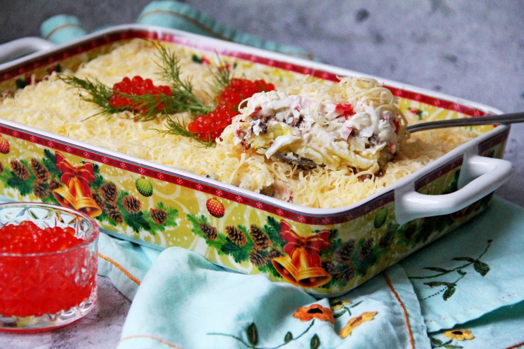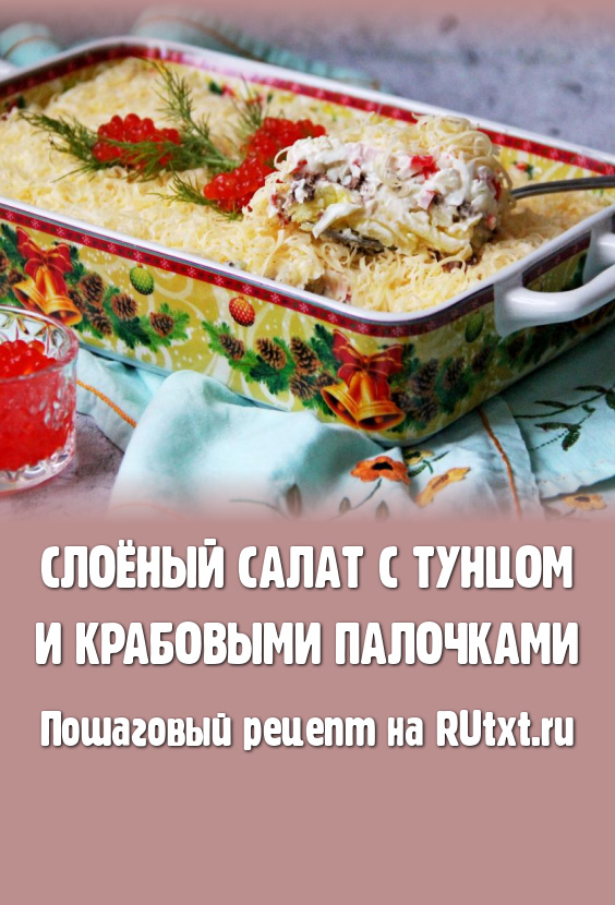 На праздничный стол предлагаю приготовить красивый и вкусный слоёный салат с крабовыми палочками и консервированным тунцом. Салат формируется слоями в глубоком салатнике или в керамической форме. Чтобы блюдо получилось нежным и вкусным, ему нужно дать пропитаться в течение нескольких часов.