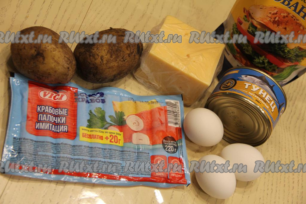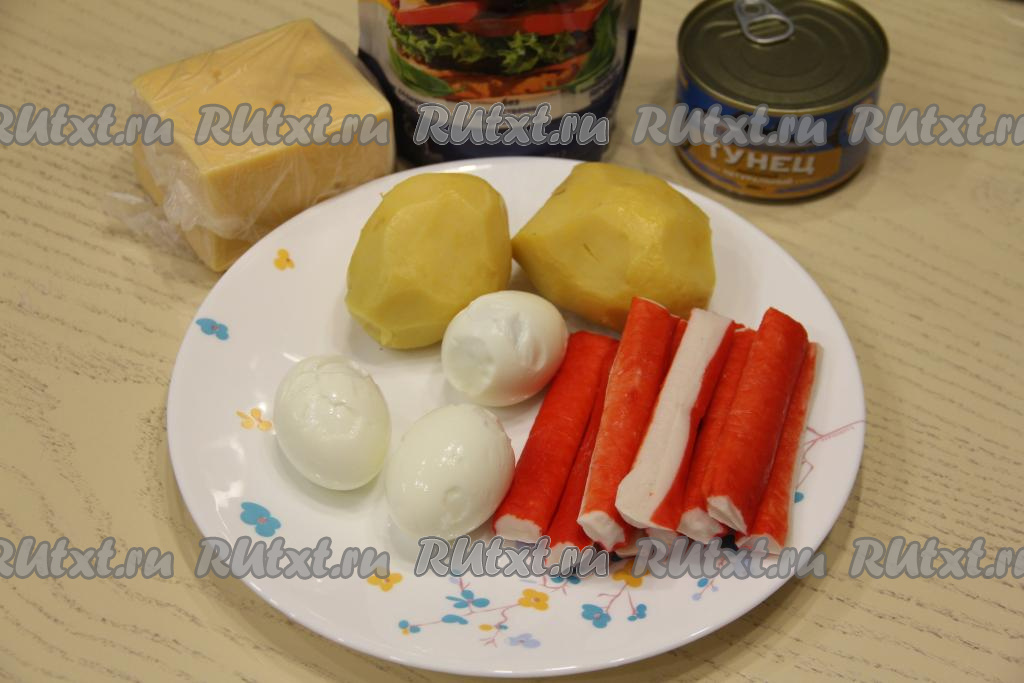 Подготовить продукты. Яйца заранее отварить в течение 10 минут с момента закипания воды, а затем остудить. Картошку сварить в кожуре до готовности (в течение минут 25 с момента закипания воды, картофель должен легко прокалываться вилкой), затем остудить. Если крабовые палочки заморожены, их нужно полностью разморозить.