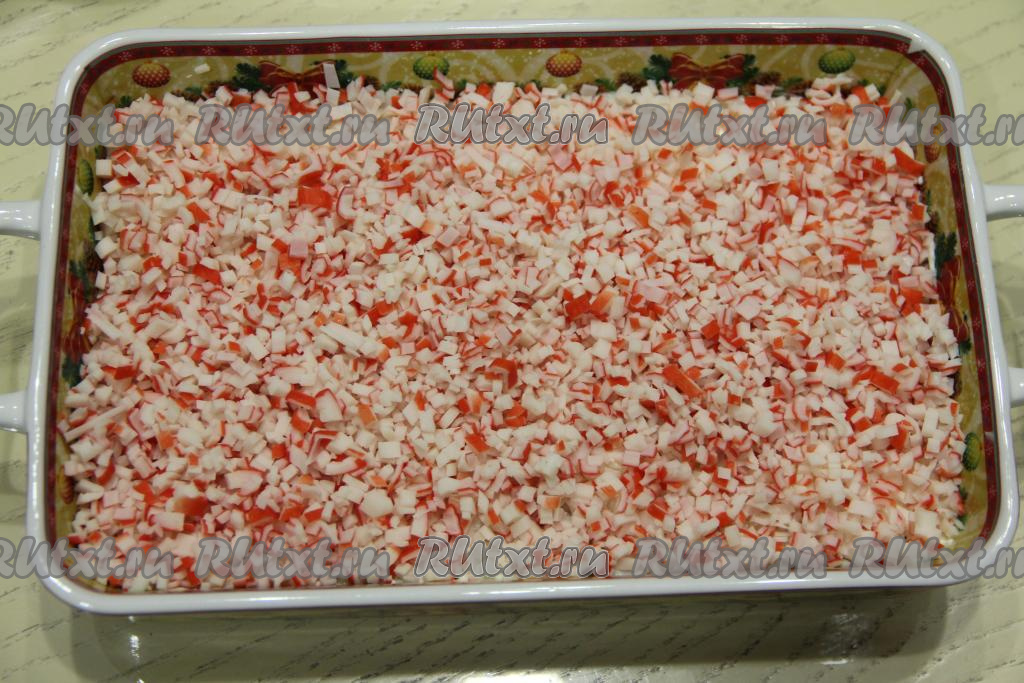 Дальше выложить слой мелко нарезанных крабовых палочек.