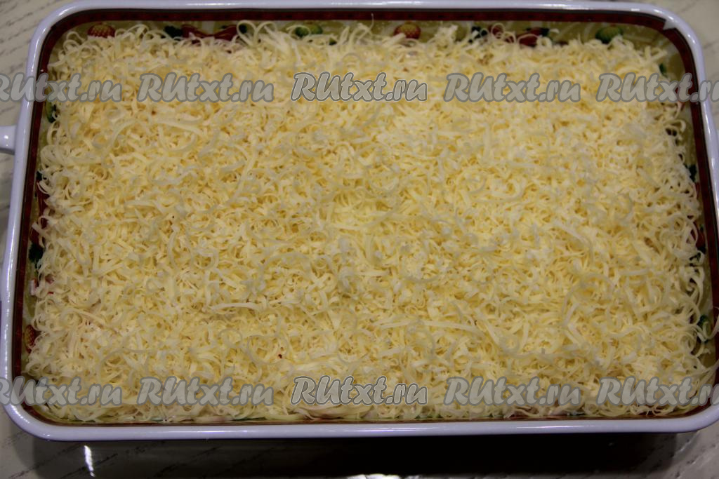 Картошку натереть на крупной тёрке и равномерно выложить на дно формы первым слоем. Слегка посолить.