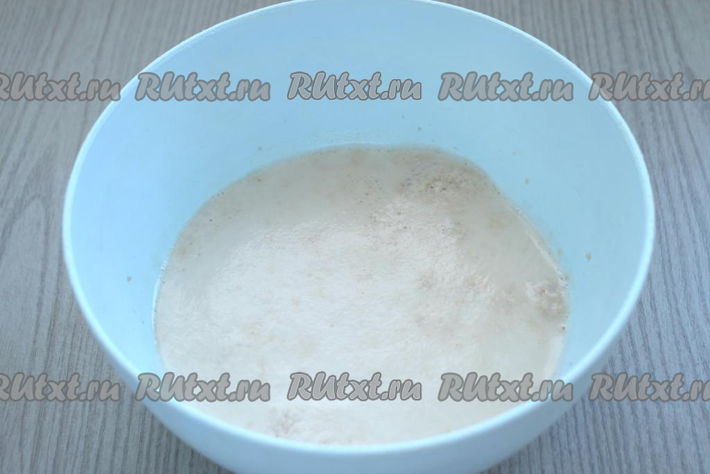 Накрываем миску полотенцем и оставляем в тёплом месте на 10 минут. За это время дрожжи активируются и на поверхности молока образуется пенная шапка. Пока дрожжи активируются, растапливаем сливочное масло, даём немного остыть.
