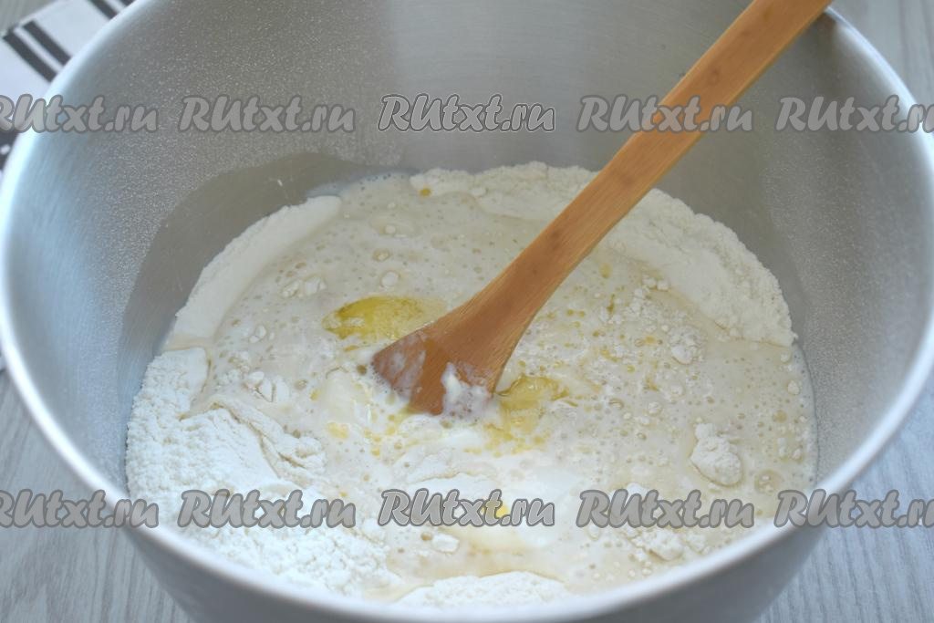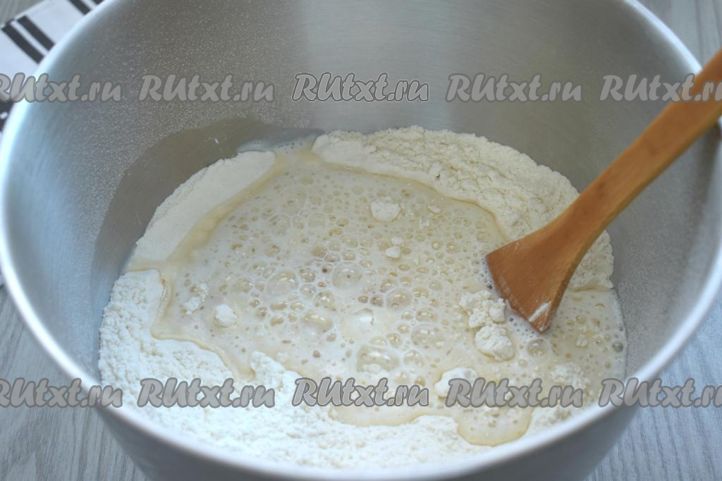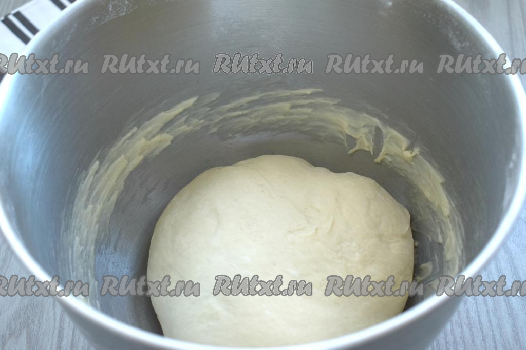 Перемешиваем ингредиенты сначала ложкой, а когда тесто начнёт собираться в ком, продолжаем вымешивать его руками, добавляя муку по мере необходимости. Вымешиваем тесто минут 7-10. Тесто должно стать мягким, не липнущим к рукам, но не забитым мукой. Поэтому муку нужно добавлять понемногу и только если она необходима. Миску с тестом накрываем полотенцем и ставим в тёплое место на 1-1,5 часа. За это время тесто увеличится в размере в 2 раза.