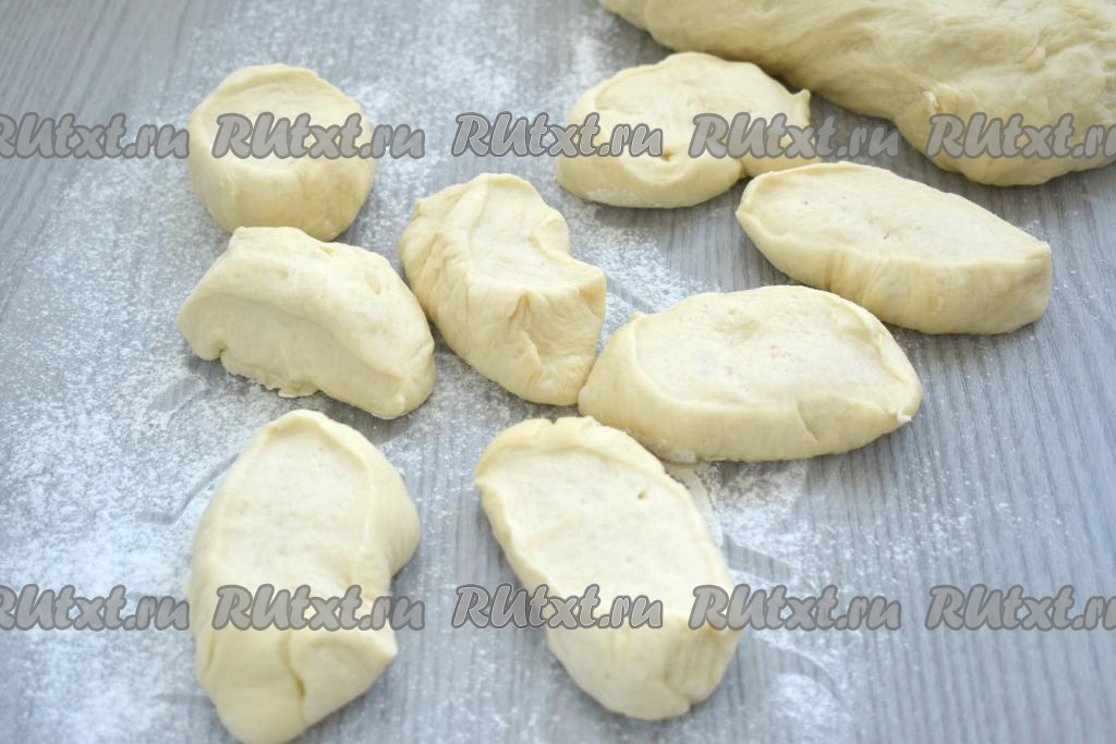 Поднявшееся тесто обминаем, делим примерно на 16-18 кусочков.