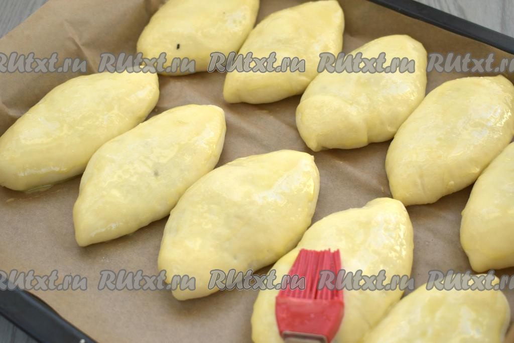 Спустя это время смазываем пирожки взбитым яйцом и отправляем в разогретую до 180 градусов духовку.