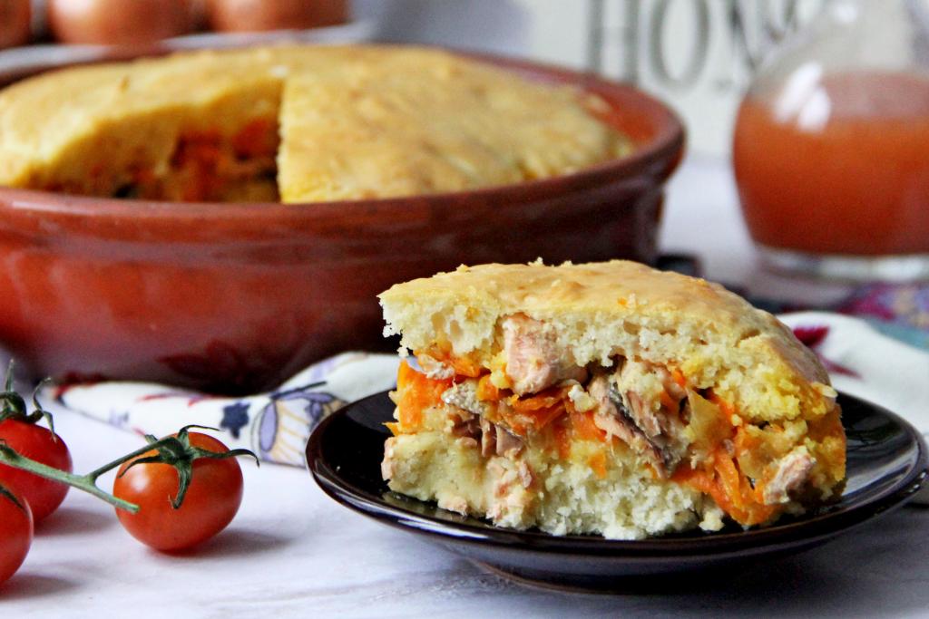 Равномерно выложить поверх теста остывшую начинку из горбуши, моркови и лука.