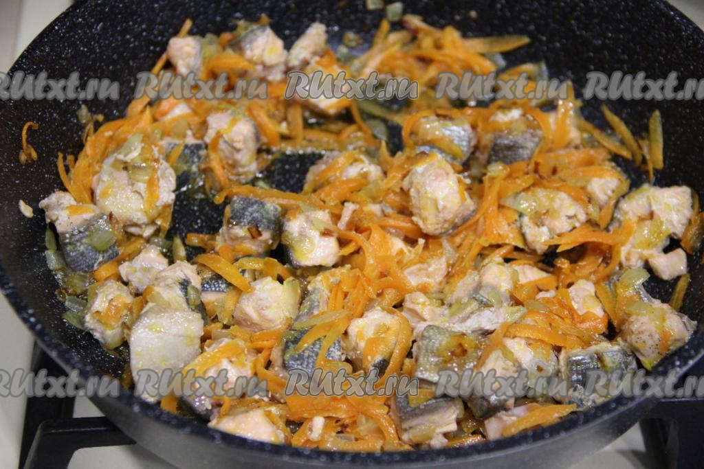 Обжарить горбушу с овощами в течение 5 минут, иногда помешивая, посолить по вкусу, хорошо перемешать, снять сковороду с огня, дать остыть и начинка для заливного пирога готова.