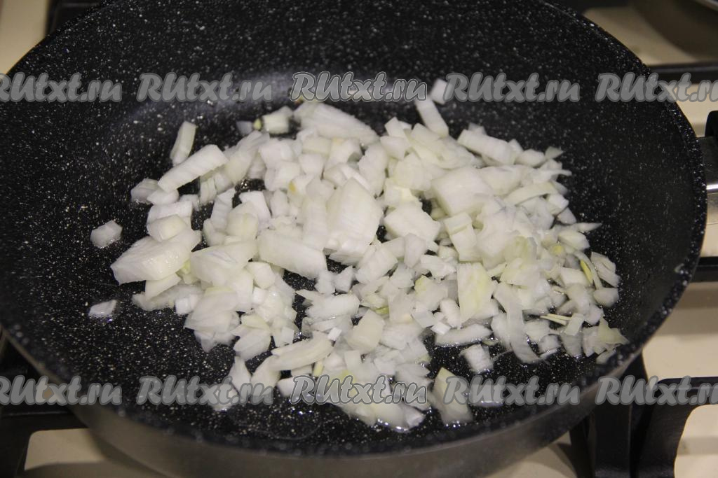Пока сода гасится в кефире, займёмся приготовлением начинки. Для этого в сковороде нужно прогреть растительное масло, выложить в него мелко нарезанный лук.