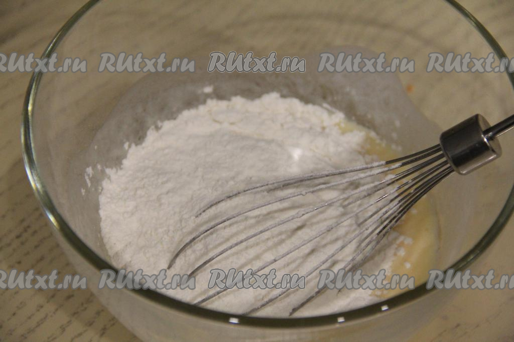 Всыпать грамм 100 просеянной муки, перемешать венчиком.