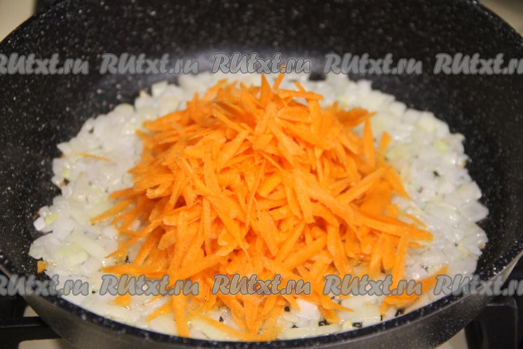 Периодически перемешивая, обжарить лук на среднем огне до прозрачности (в течение 4-5 минут). Затем добавить к луку натёртую на крупной тёрке морковку, перемешать. Обжаривать овощи минут 5-6 (до мягкости моркови), время от времени помешивая