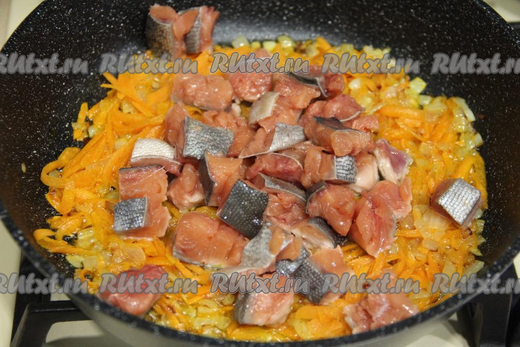 К обжаренным овощам выложить кусочки филе горбуши, перемешать.