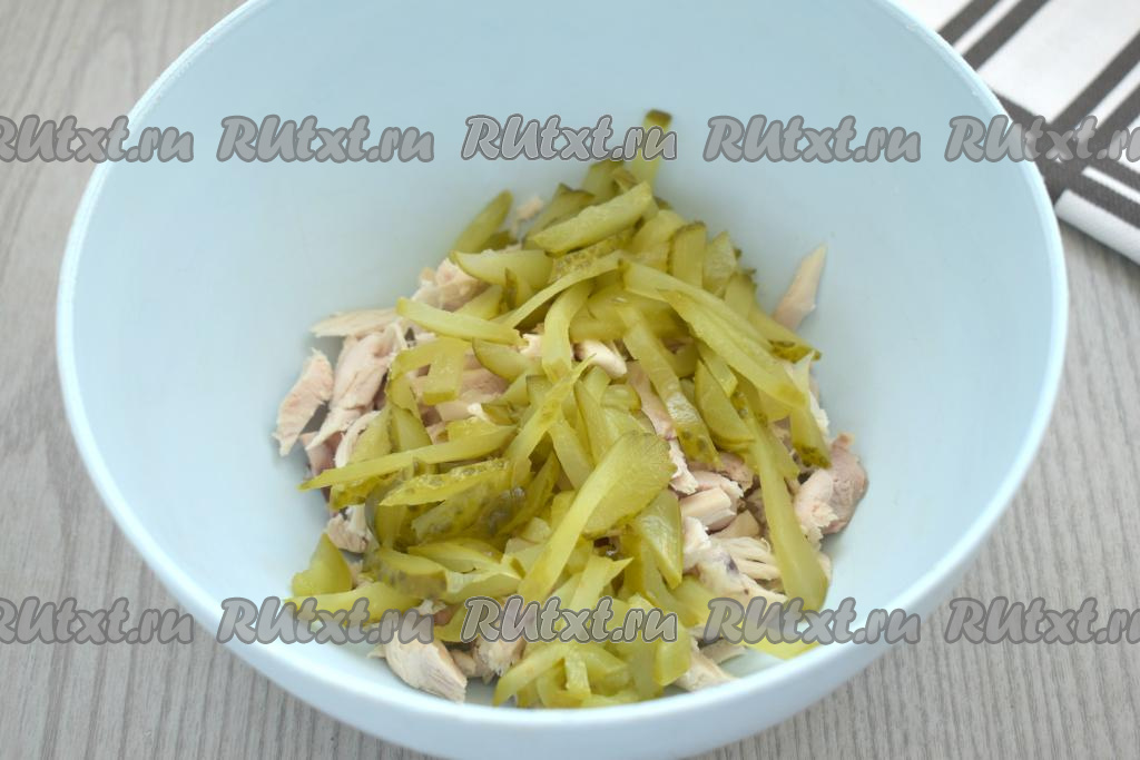 Маринованный огурец тоже нарезаем на маленькие брусочки, добавляем к курице.
