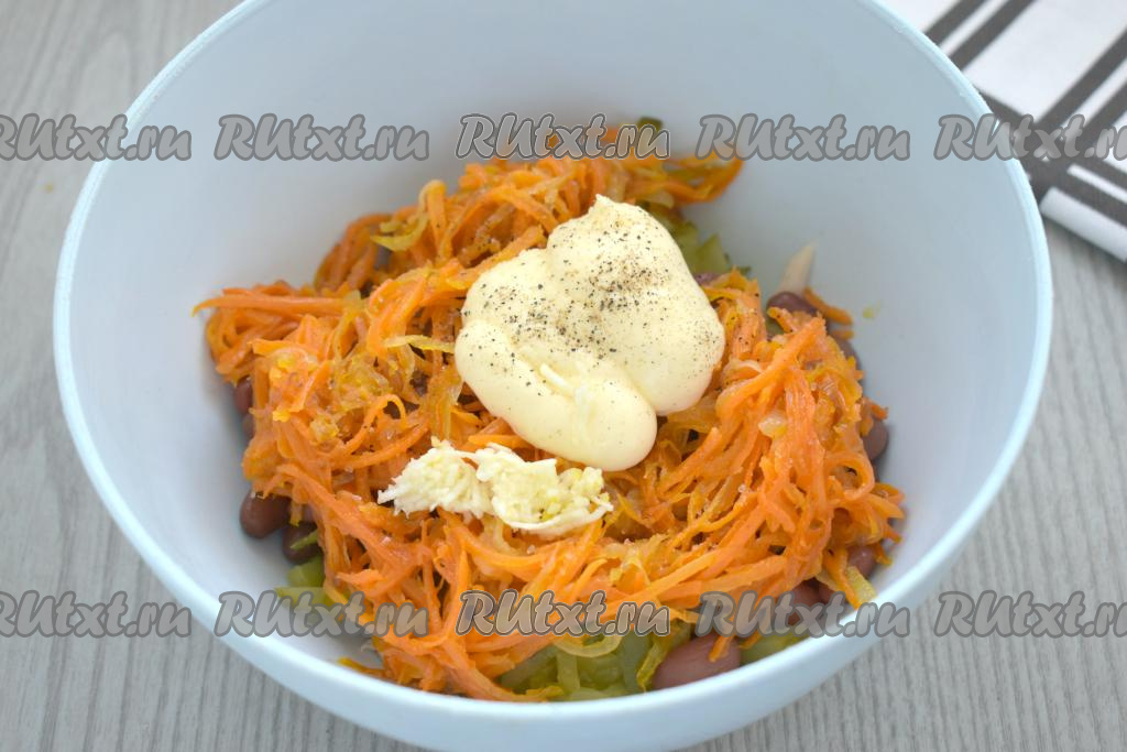 Добавляем пропущенный через пресс зубчик чеснока. Заправляем салат майонезом, по вкусу солим и перчим.