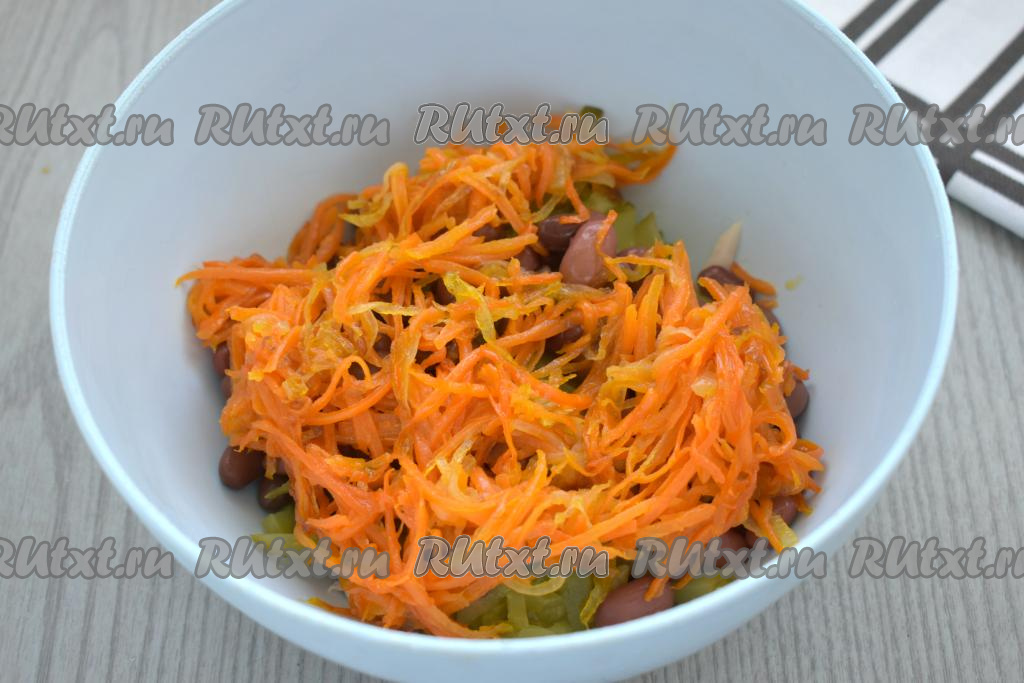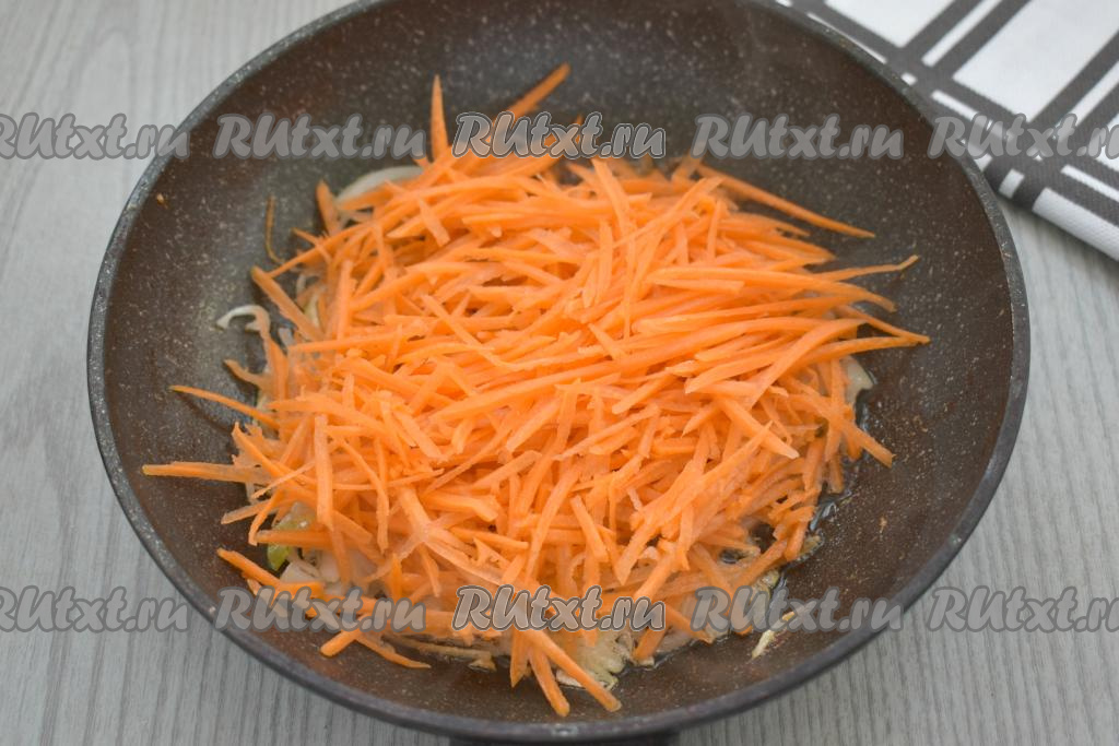 Морковку натираем на тёрке для моркови по-корейски (если такой тёрки нет, можно натереть морковь на крупной тёрке), добавляем к луку, обжаренному до мягкости, перемешиваем. Обжариваем овощи на небольшом огне под крышкой 4-5 минут (до мягкости моркови), иногда помешивая. Обжаренные овощи убираем с огня, даём остыть.