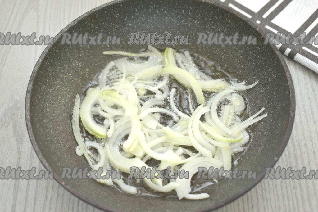 Заранее отвариваем куриное филе в подсоленной воде (в течение 25-30 минут после закипания воды), даём остыть. Морковь, чеснок и лук очищаем. Нарезаем лук на тонкие полукольца. Разогреваем на сковороде растительное масло, выкладываем нарезанный лук и обжариваем его минуты 3-4 (до мягкости), периодически перемешивая, на среднем огне.
