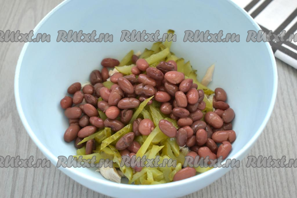 Консервированную фасоль сначала перекладываем из банки в сито, ополаскиваем холодной водой, лишней воде даём стечь. Добавляем фасоль в миску с курицей и огурцами.