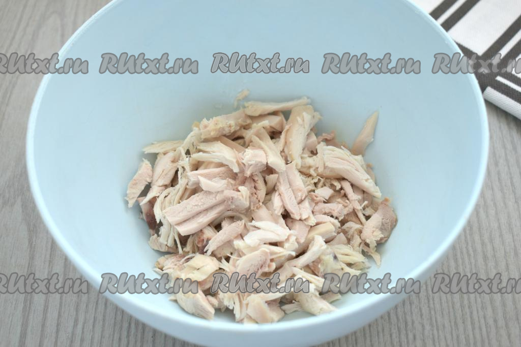 Куриное мясо нарезаем на небольшие брусочки, складываем в миску.